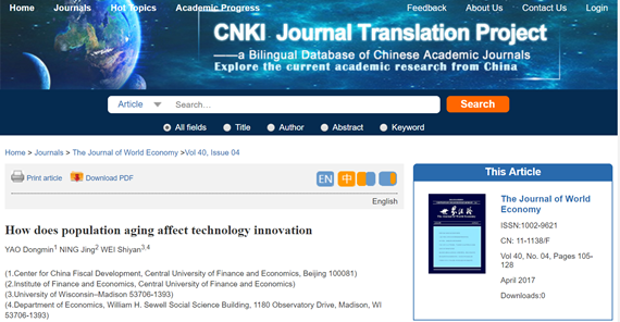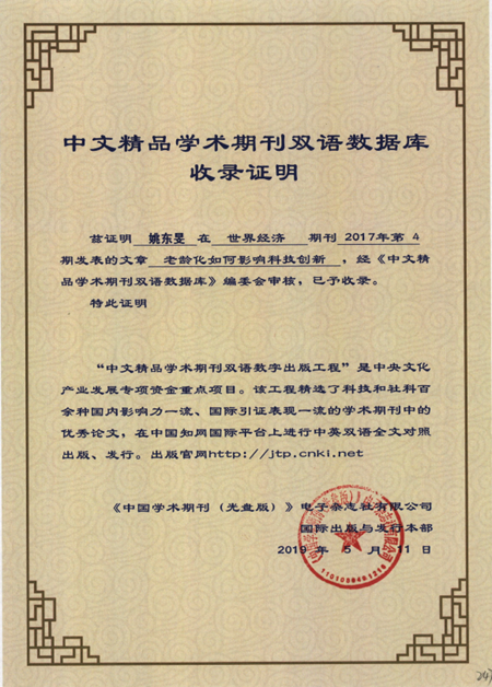 近日,中国财政发展协同创新中心姚东旻副教授的文章《老龄化如何影响科技创新》被中国知网“中文精品学术期刊双语数据库”(简称JTP)收录。《老龄化如何影响科技创新》原载《世界经济》2017年第4期。