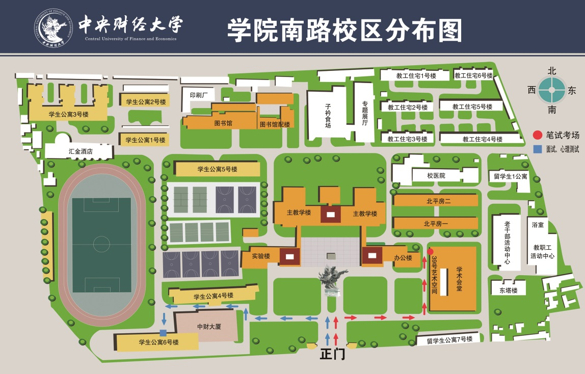 1.进入正门后可沿上图红色虚线指引到达学术会堂北门,乘坐电梯到达二层202考场或四层402考场。