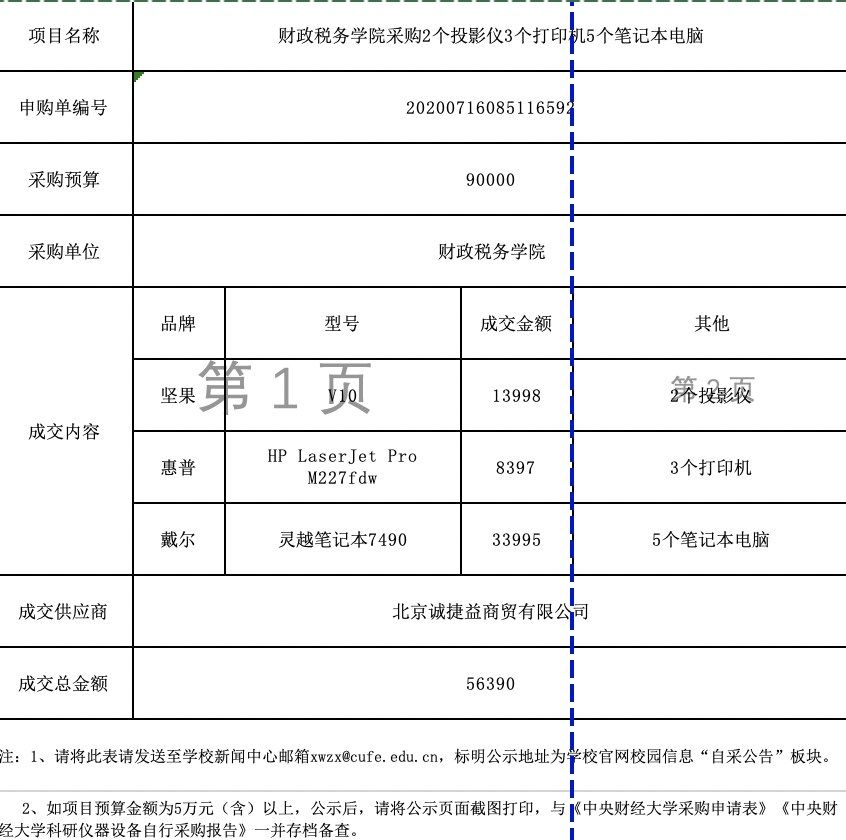 财政税务学院采购2个投影仪3个打印机5个笔记本电脑自行采购需求及结果公示(预算金额≥5万元)